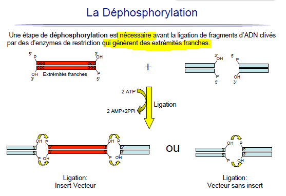déphospho les 2, c'est bête car on ne peut plus former la liaison 3'-5' phosphodiester si on a pas au moins 1 phosphate en 5' ( ici il reste que le P en 5' de l'insert vu qu'on déphospho en 5' du vecteur)