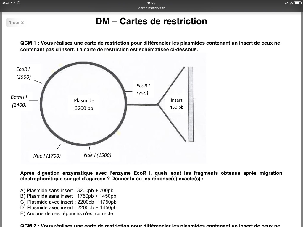 Or, la correction indique : Plasmide avec insert : 2200pb + 1450pb !