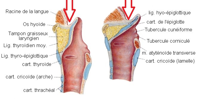 La différence entre le schéma à droite et à gauche est simplement le phénomène de déglutition. L'épiglotte se rabat (sur la photo de droite) sur la trachée pour éviter les fausses routes donc la vallécule augmente de taille.