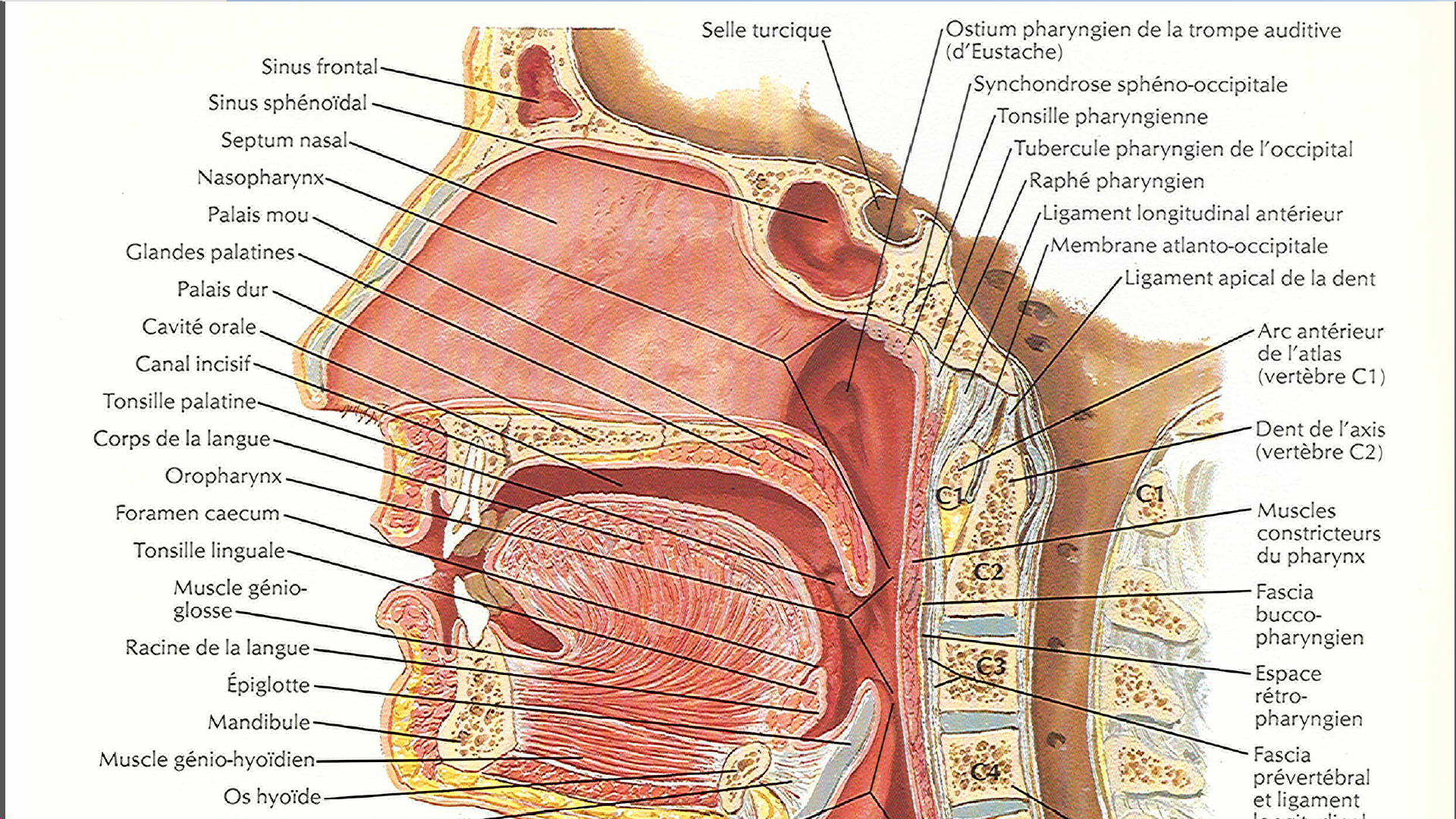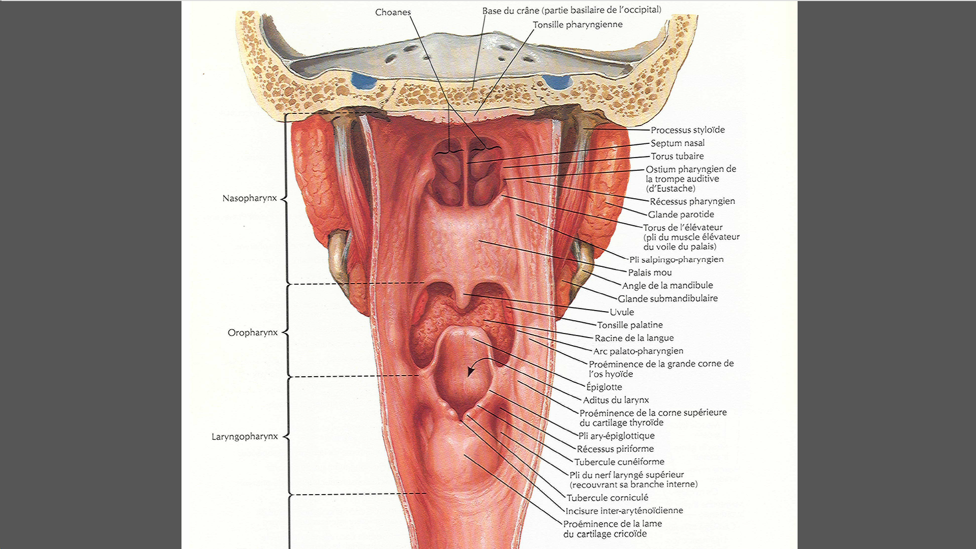 J'ai une question par rapport à la coupe horizontale du pharynx qui est fait en C6 (d'après la légende du schéma 12) : je n'arrive pas à comprendre comment on peut voir les tonsilles palatines et pharyngées à ce niveau , sachant qu'elles se situent beaucoup plus haut ; rien que le fait qu'elles soient présentées sur la même coupe me paraît bizarre ..
