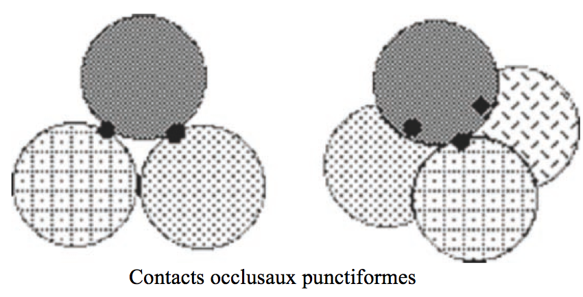 " Une surface convexe venant en contact avec deux surfaces convexes crée deux points de contact : relation entre une cuspide et deux dents antagonistes : deux points sur les crêtes marginales, un sur chaque crête de chaque dent.