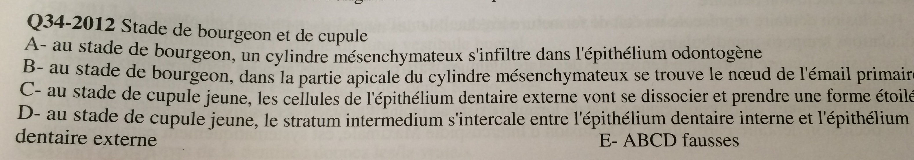 Q34 : La réponse donnée est AB, cependant j'ai compté la A fausse car c'est pas plutôt l'inverse : un cylindre d'épithélium qui s'infiltre dans le mésenchyme ?