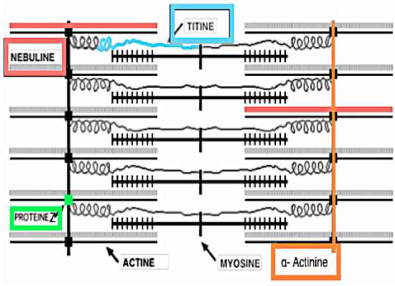 "…la titine se fixe à son niveau afin de permettre la relaxation musculaire" -> Alors je n'avais strictement pas compris que la titine venait s'accrocher aussi "loin" sur le filament de myosine, dans tous les schémas que j'ai vu on dirait qu'elle s'accroche plutôt au niveau des têtes, de la méromyosine lourde, comme une ressort au bout du filament, à moins que j'ai raté un de vos schémas stylés ?