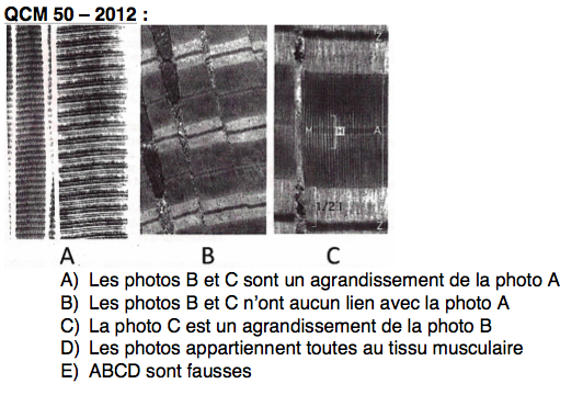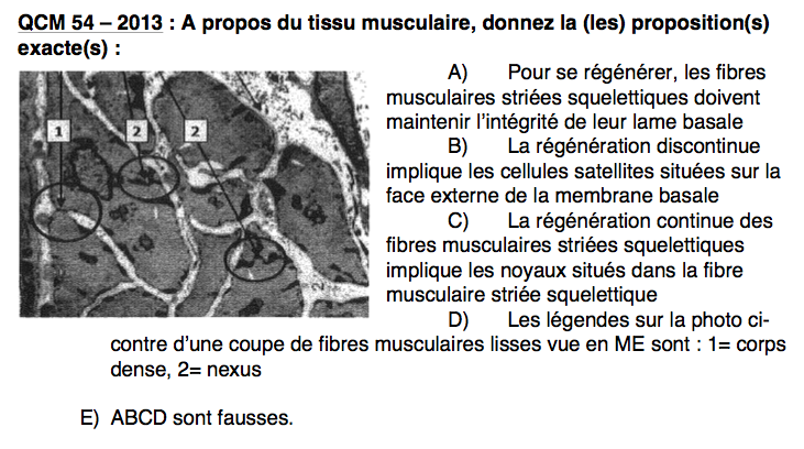 :arrow: QCM 54 : Je suis d'accord pour le fait que A et C soit vrai mais sur la photo on nous montre un Tissu musculaire Lisse et dans les items on nous parle de TM strié squeletique.. du coup j'ai compté faux :beat-up:
