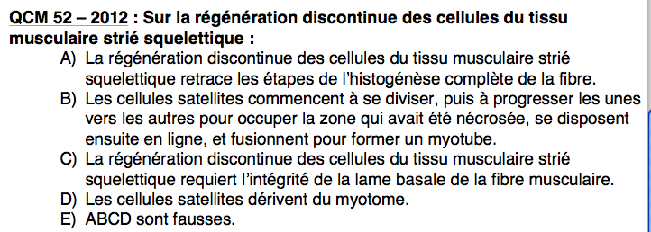 :arrow: QCM 52: Pour la regénération Discontinu, se sont les cellules satelittes elles mêmes qui vont se mettre au centre pour reformer un myotube ?? Je pensais qu'elles donné des myoblastes et que c'était eux qui allez le reformer...