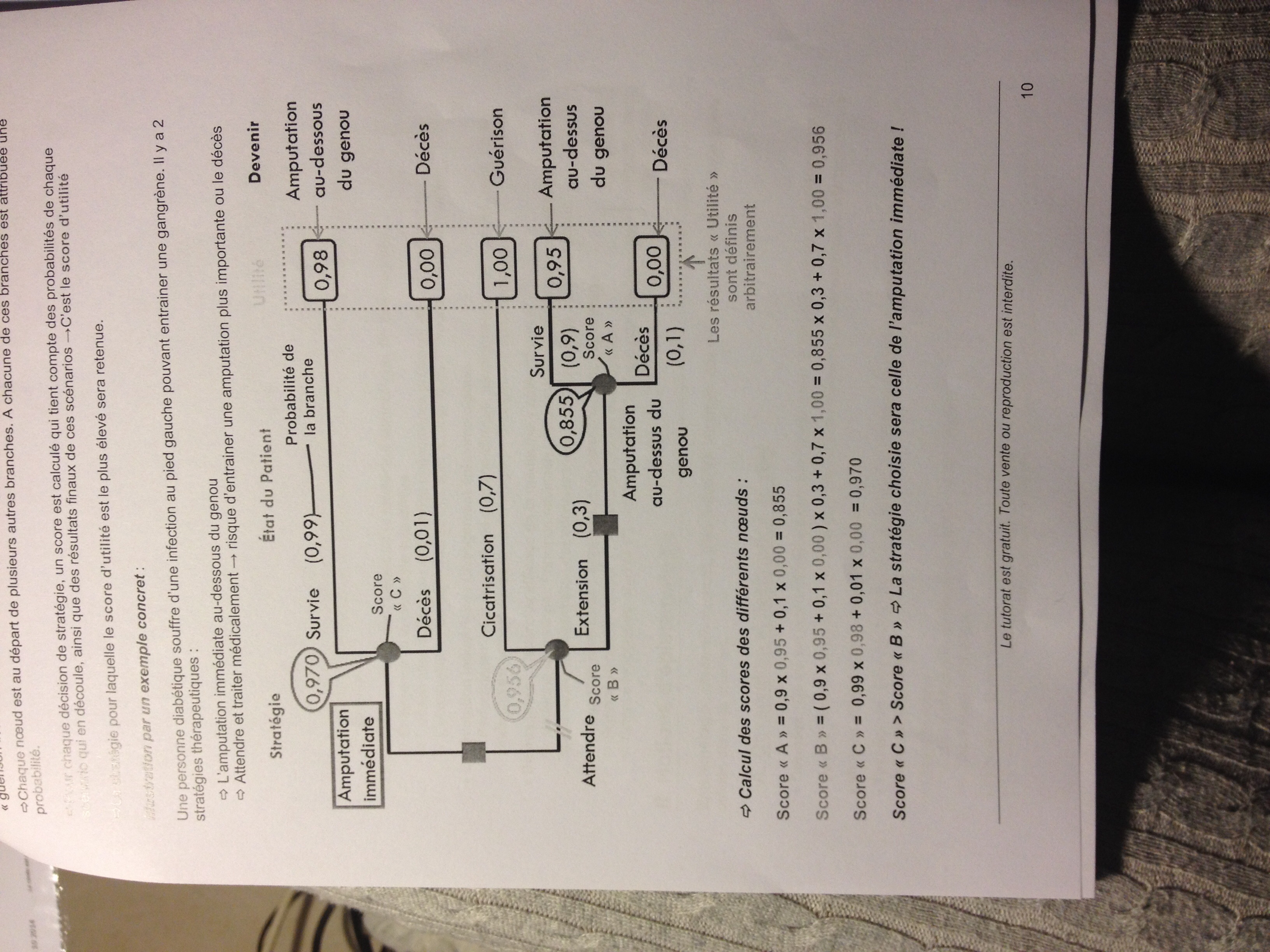 En fait tu calcules les pourcentages de survie pour chaque noeud : donc pour chaque décision thérapeutique tu as un score à chaque noeud et tu les compares.