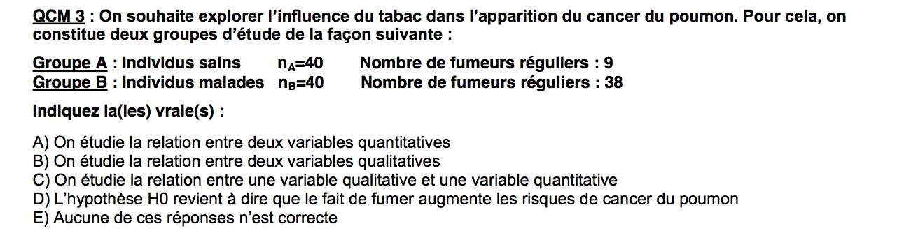 Je trouve ça hyper ambiguë de dire que c'est une variable qualitative, surtout que dans la correction ils disent qu'on étudie la relation entre le fait d’être fumeur / non-fumeur et le fait d’être malade / non malade (=> donc deux variables qualitatives binaires) alors que dans l'énoncé il est juste question d'être "fumeur régulier"...