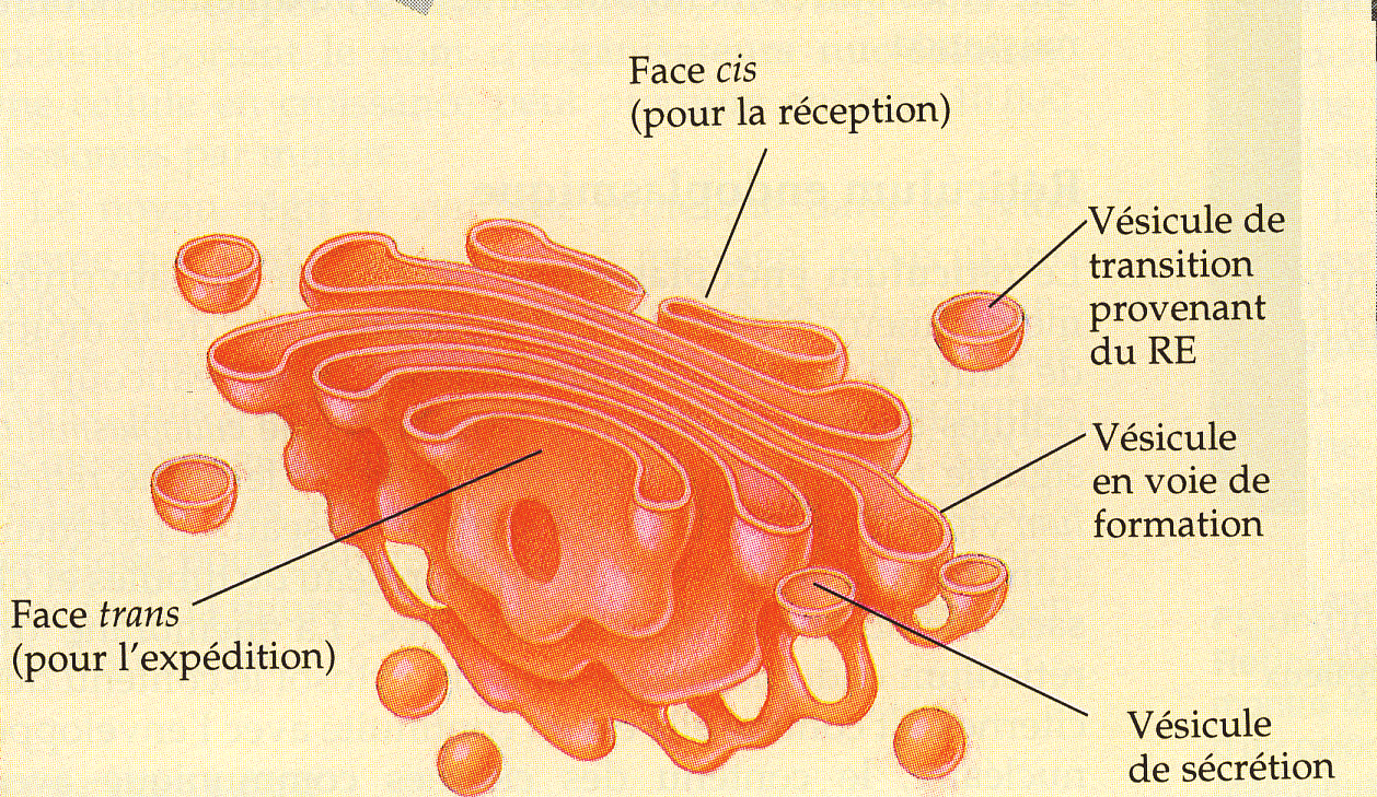 le Golgi, composé de sortes de citernes empilées, comme des saccules : ça s’appelle des dychtiosomes et il y en a un ou plusieurs pour le Golgi.