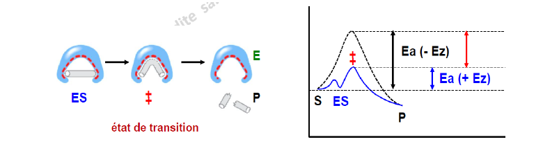 état de transition où l’enzyme et le substrat sont sous formes contraintes, ce qui apporte le complément énergétique nécessaire à la réalisation de la réaction.