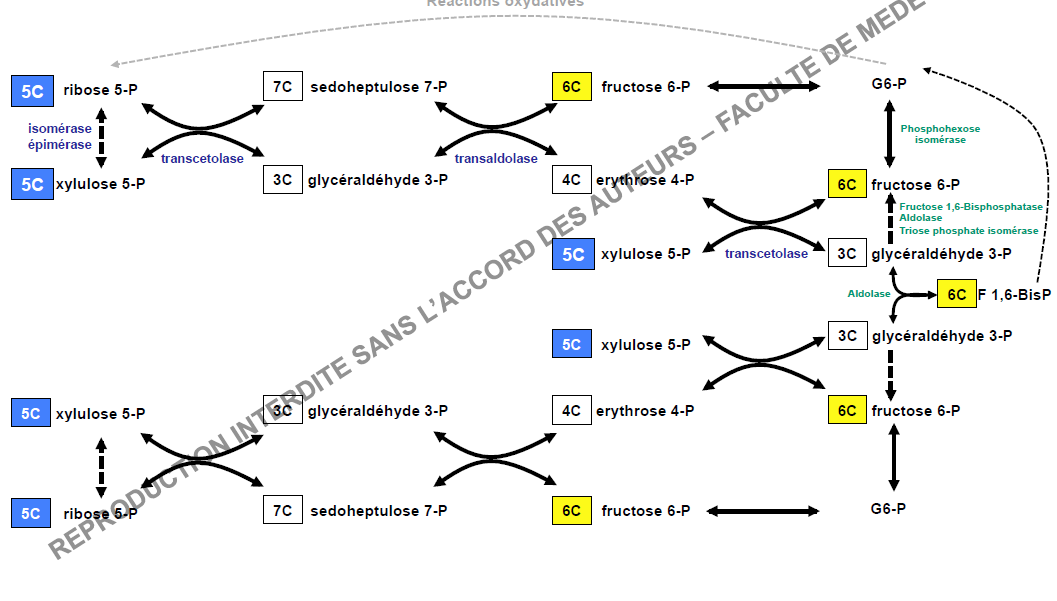 On part de la phase d'interconversion des oses avec le ribose 5P et le xylulose 5P. A la 2ème réaction on a formation de Fructose 6P et de un sucre à 6C (2 en fait comme on va le voir après). Puis à la réaction d'après on reforme du Fructose 6P (donc 2) et la dernière réaction unit 2 Glycéraldéhydes 3P entre eux pour former du Fructose 1,6bisP (1 seul cette fois ci)