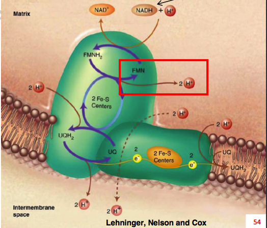Lorsque le FMNH2 donne 2 électrons aux protéines fer soufre, les protons sont bien relargués dans la matrice mitochondriale. J'ai entouré sur le schéma, regarde :