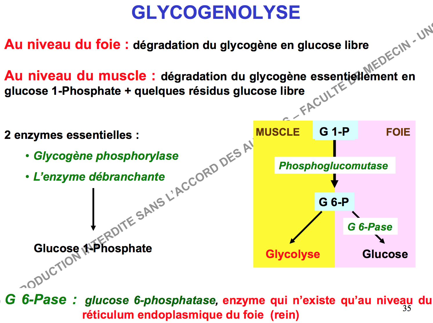 En fait, l'action combinée de la GP et de l'enzyme débranchante permettent de libérer majoritairement du glucose-1 phosphate. Mais l'activité alpha 1-6 glucosidase de l'enzyme débranchante permet de libérer un glucose via hydrolyse de la liaison alpha 1-6