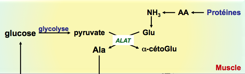Tu vois que les AA vont transférer leur NH3 au glutamate (et ca se fait via ASAT, qui n'est pas mentionné sur le schéma mais elle serait au niveau de la flèche qui va du NH3 au Glutamate). Et ensuite seulement le Glutamate donnera son NH3 au pyruvate issu de la glycolyse pour donner de l'Alanine, qui ira au foie faire la NGG :glasses-nerdy: