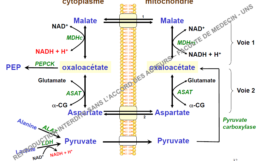 J'ai rien trouvé en cherchant j'espère ne pas faire un double post; dans la NGG on peut faire sortir notre AOA sous forme de Malate et ça pas le biais de la navette malate/aspatate. Par rapport à son utilisation dans les autres voies j'étais persuadé que son sens de fonctionnement n'était pas réversible et que par exemple la translocase malate/apha-céto ferait toujours rentrer du malate et sortir de l'alpha ceto glutarate. Dans la NGG on refait sortir du malate par cette navette autant dire que c'est un monde qui s'écroule pour moi