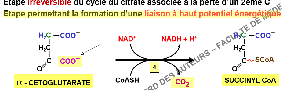 " L’alpha-cétoglutarate déshydrogénase catalyse la seule étape du cycle transférant directement une liaison à haut potentiel énergétique ": Reponse:vrai
