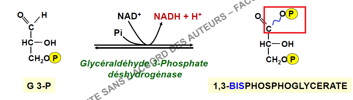 B) La Glycéraldéhyde 3-Phosphate déshydrogénase permet la formation d’une liaison haute en énergie. Compté vrai.