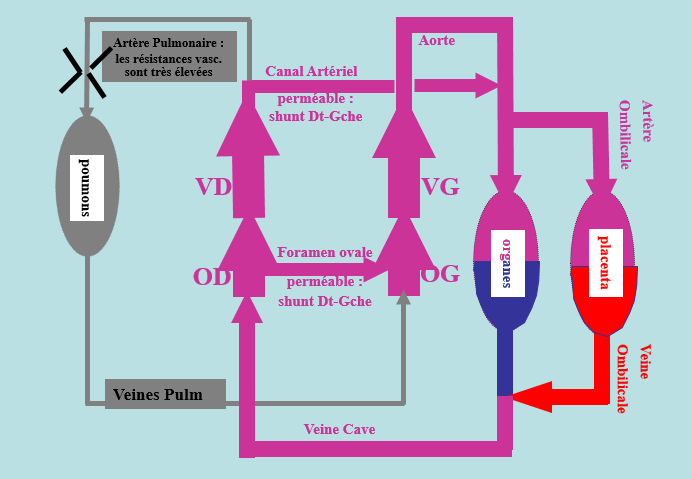 => la veine ombilicale va rejoindre le système cave inférieur du bébé mais pourtant dans la circulation pulmonaire adulte le sang revient par les veines pulmonaires, je ne comprend pas trop pourquoi il va vers la vci Quand on dit que la vascularisation foetale a un mode identique à la circulation pulmonaire adulte c'est parce que le sang saturé en O2 est transporté par la veine et que le sang désaturé en O2 est transporté par les artères (à la différence de la circulation générale chez l'adulte)