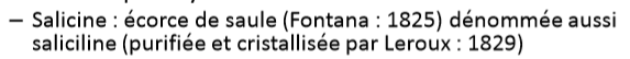 Petit soucis : "La salicine (=saliciline) est extraite de l'écorce de saule par Fontana en 1825", puis "elle est purifiée et cristallisée par Leroux en 1829"
