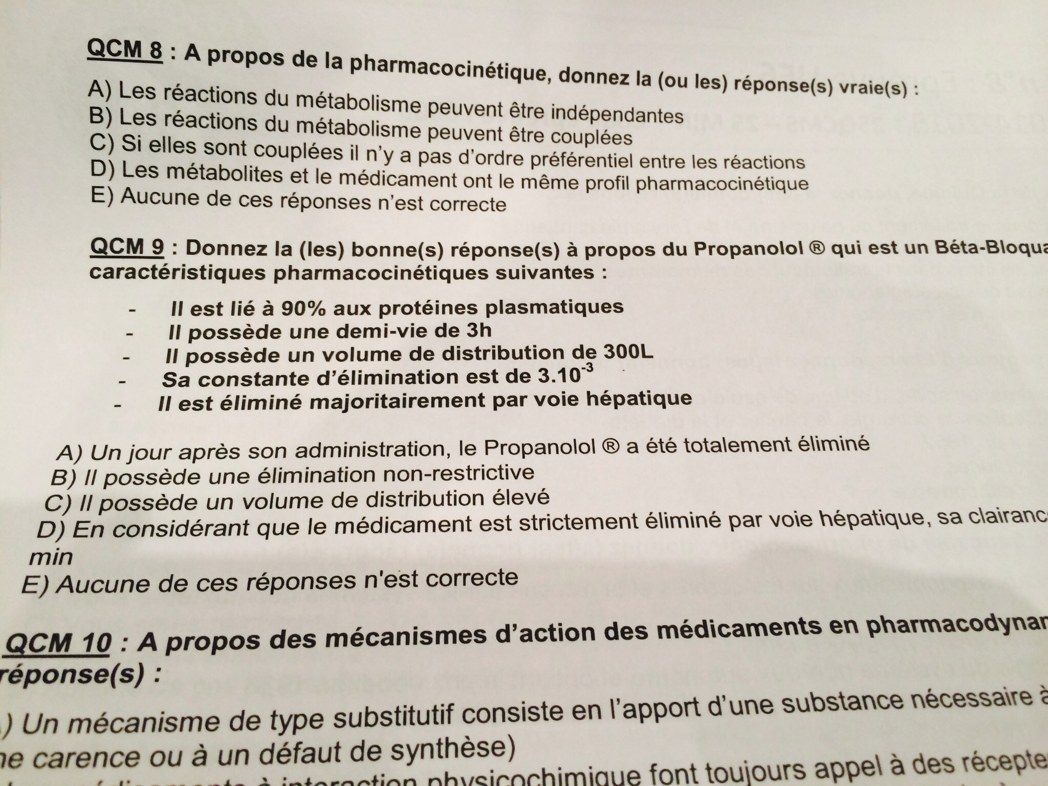 Gray a écrit:Effectivement toutes les étapes de la PK sont liées, mais là on vous parle d'élimination dans l'item. Et ce qui s'y rapportait était qu'on vous dise que le médicament est majoritairement éliminé par le foie. La liaison aux protéines plasmatiques n'intervient pas dans l'élimination, c'est là qu'était le piège. Vous avez confondu avec la liaison aux protéines plasmatiques qui se rapporte à la distribution. Si dans l'item on vous parlait de distribution non restrictive, effectivement comme dit plus haut, l'item aurait été faux car le médicament est lié à 90% aux protéines plasmatiques. C'est mieux?