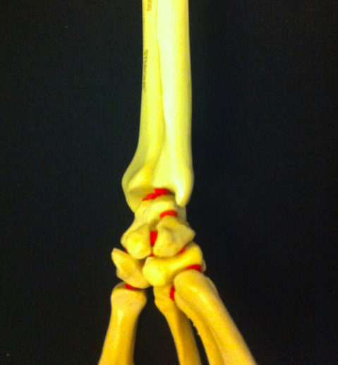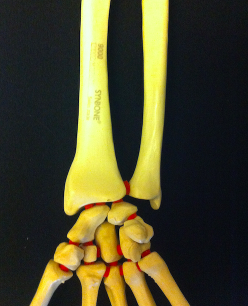 1) Sur la vue de face du radius, on voit bien au niveau de sa face médiale l'articulation radio-ulnaire inférieure.