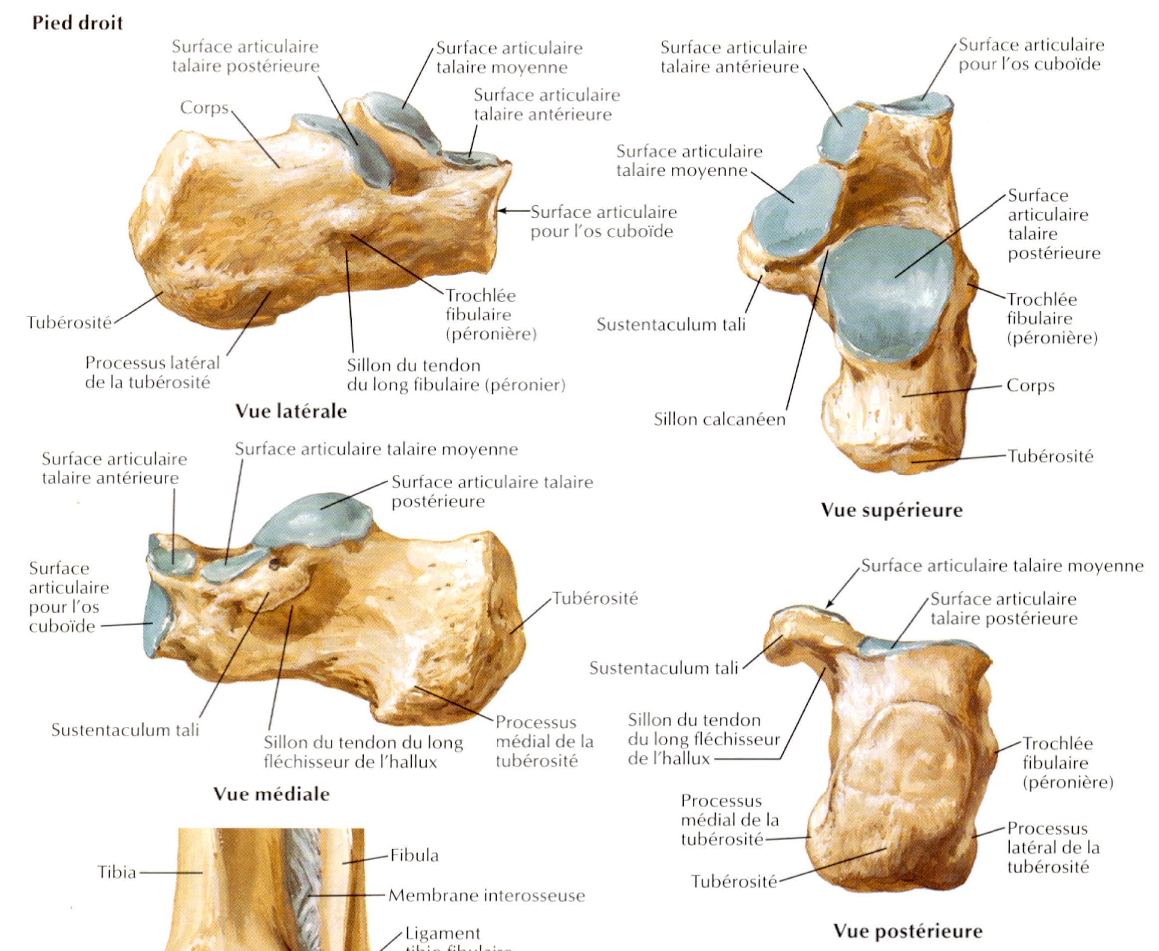 Je sais que c'est pas cool comme question, mais sur la fiche, il y a des éléments qui sont mis en vue supérieure vs antérieure sur la fiche (par exemple les surfaces articulaire taliennes, ou encore on dit sur la ronéo que le bec du calcanéus apparait en vue latérale alors que c'est en vue médiale sur le schéma de la fiche..) et je suis toute perdue..