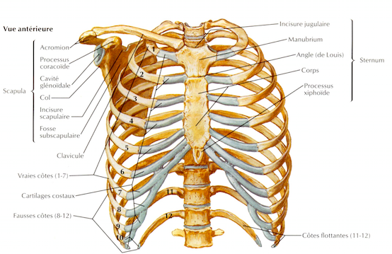 J'ai l'impression qu'il y a une petite contradiction entre le texte (page 6), où l'on nous dit qu'il y a 7 vraies côtes qui rejoignent le sternum par une pièce cartilagineuse qui leur est propre, et le schéma numéro 23 où l'on voit que la 7ème côte + les 3 fausses côtes rejoignent le sternum par une pièce cartilagineuse commune avec la 6ème côte.