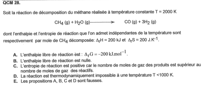 Je pense que pour l'item D tu dois tout simplement appliquer la formule: ΔGsyst = ΔHsyst −T.ΔSsyst vu qu'ils disent que les valeurs de ΔHsyst et de ΔSsyst sont indépendantes de la température. En calculant pour T= 1000K tu as ΔG=0 donc pour T<1000K ton ΔG>0 ce qui fait que d'après le cours la réaction est thermodynamiquement impossible