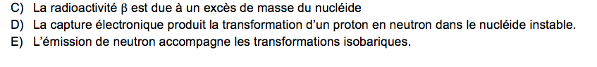 La E est fausse on n'a pas d'émission de neutron dans les transformations isobarique ! Regarde rapidement les diapo tu verras que dans les réactions il n'y a pas de neutrons ! C'est dans la réaction de fission que l'on a des neutrons.
