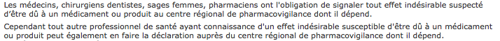 Dans un des QCM que j'ai fait, j'ai eu l'item: "La notification de pharmacovigilance est une obligation pour tous les professionnels de la santé", compté vrai mais dans le cours de pharmaco il me semble que ce n'est pas obligatoire par exemple pour le kiné, qui PEUT déclarer par exemple un EI mais il n'est pas obligé contrairement au pharmacien ou au médecin...