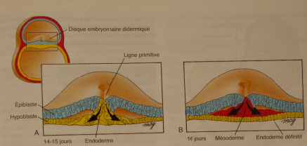 ?Les premières cellules à migrées vont donner l'endoderme définitif (revètement du futur intestin et de ses dérivés) qui pousse et remplace l'hypoblaste. Puis les prochaines cellules vont donner le mésoblaste intra embryonnaire (lui il se subdiviseras en myotome sclérotome et dermatome). Il faut savoir qu'il existe une zone de mésoderme cardiogénique en avant de la membrane oro-pharyngée.