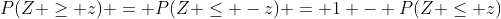 j'aurais besoin d'une petite précision par rapport à la "formule" P(Z>-z) = 1-P(Z<z), ça ne me parait pas du tout logique car dans la table on a les probas pour P(Z<-z) plutot non ? Donc est ce que ca ne serait pas plutot P(Z<-z) = 1-P(Z<z)