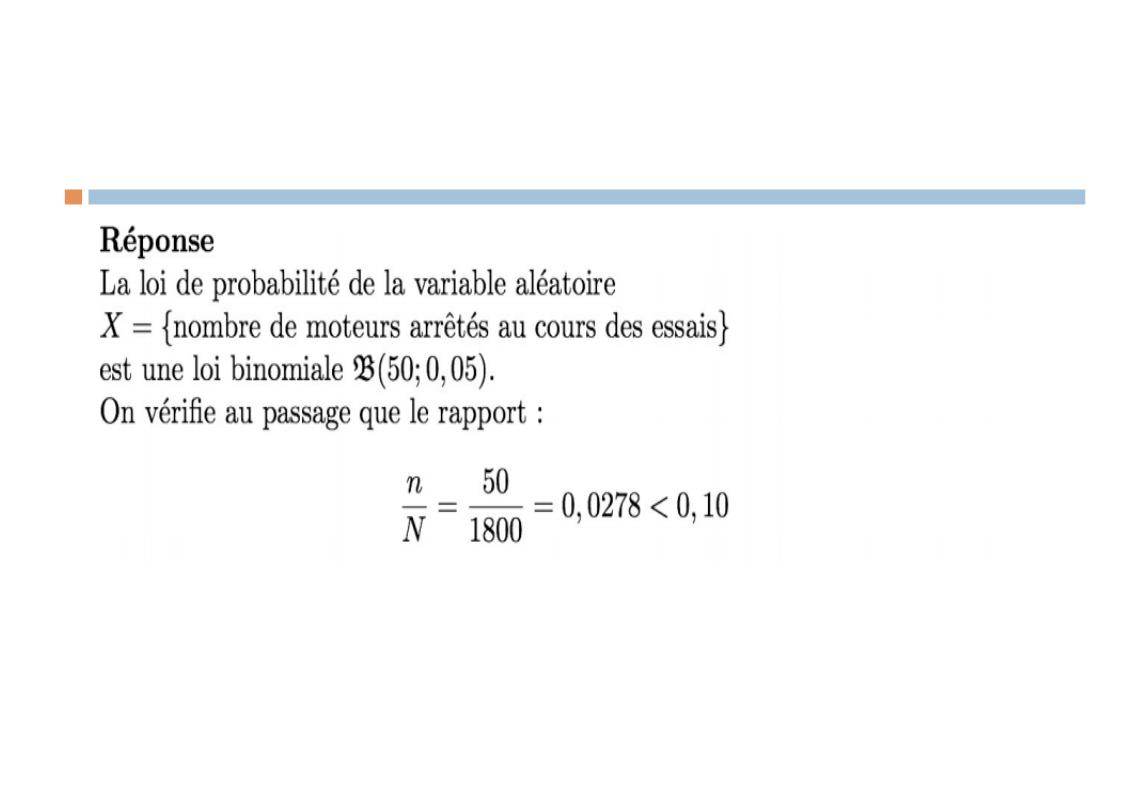 Sujet : une entreprise fabrique des moteurs tel que 95% d'entre eux doivent fonctionner à une température de 125°C . Un contrôle est effectué sur un échantillon de 50 moteurs sur un lot de 1800 moteurs, e n les plaçant dans un four à 125°C. On s'interesse au nombre de moteurs qui ne fonctionnent plus au cours des essais