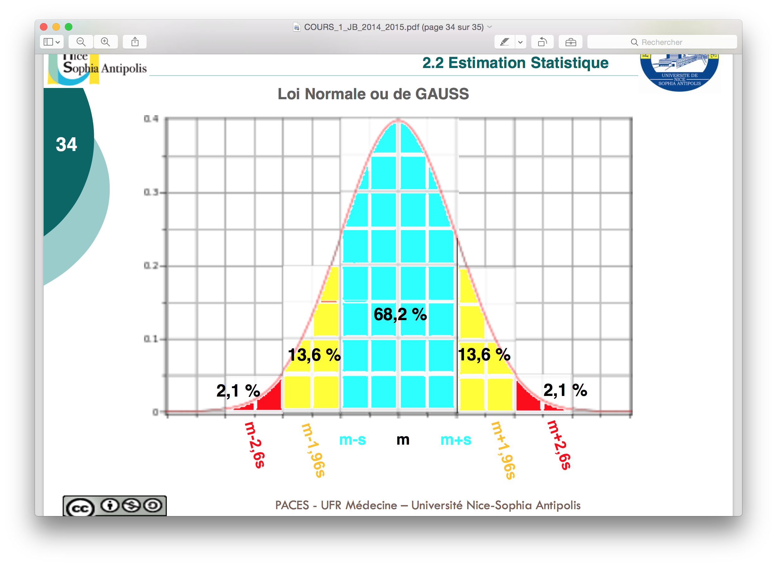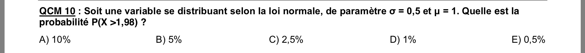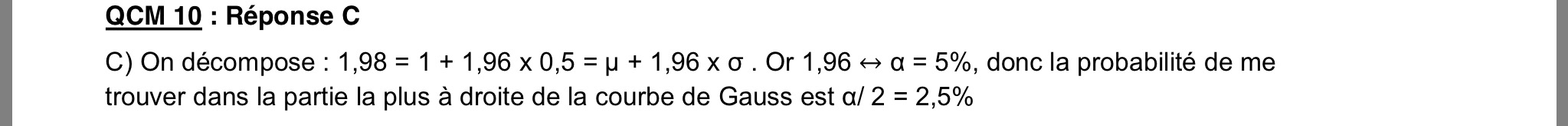 Donc tu te rend compte que pour résoudre ce QCM dans l'intervalle [mu - 1,96 sigma; mu + 1,96 sigma] tu as 95% (95,4% dans le cours de Benoliel) et de chaque coté de la courbe tu as 2,5%. Comme par hasard mu + 1,96 sigma= 1,98 donc P(X>1,98)= 2,5%