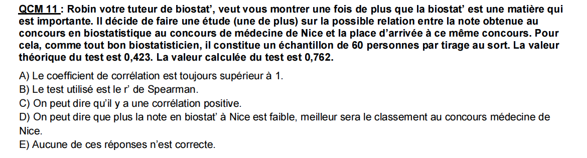 :arrow: L'item suivant aurait été juste : "On peut dire que plus la note en biostat' est bonne, meilleure sera la note au concours de médecine de Nice" ou encore l'inverse (comme il parle dans la correction je crois "plus la note est basse, moins bon est le classement"