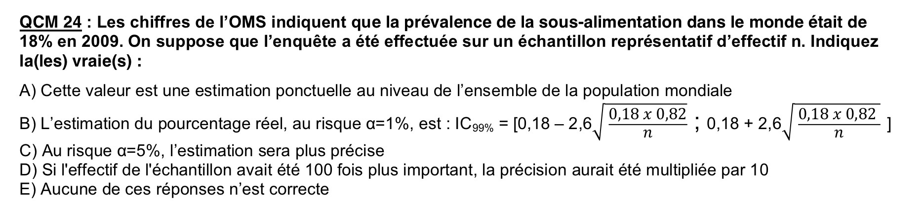 p, ton pourcentage réel appartient à : [pobs +/- ε.s] Or on sait que : s = √(po.qo/n) Donc si tu remplaces tu obtiens [pobs +/- ε√(po.qo/n)] Et en remplaçant avec les valeurs de l'énoncé la B est bien juste