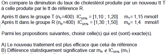 Je suis d'accord pour dire que mR ∉ IC95%(mT) mais pas pour dire que c'est suffisant pour prouver une différence significative, en général même si c'est le cas dans cet exemple; Dit autrement c'est le "car" qui me gêne dans son item.