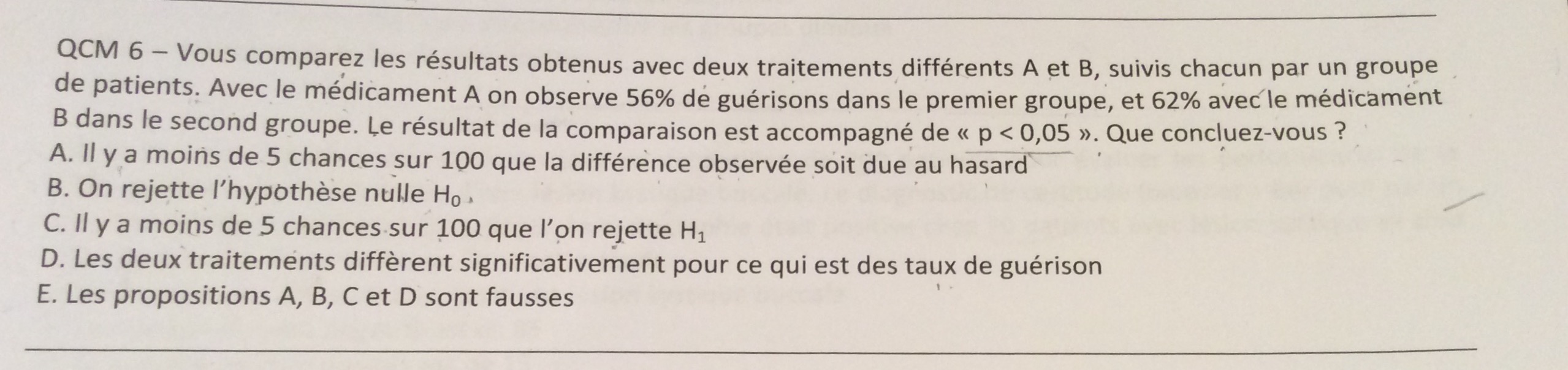 A ce que j'ai compris de la SDR (je suis pas sure donc je suis pour savoir si c'est vrai ou pas hihi) c'est que quand on marque p<0.001 ou 0.005 enfin voila, a la fin du test, c'est la probabilite de te tromper en admettant H1 vrai (c'est une probabilite post test) ! Du coup pour le qcm 6 ca veut dire que tu admets H1 donc il y a une difference significative. Voila attends confirmation d'un tuteur/tutrice !