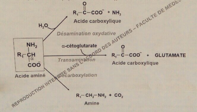 Alors ici, le prof voulait préciser les fonctions qui restaient associées au carbone Alpha du produit ^^ exemple: sous désamination oxydative (perte fonction amine) il ne reste plus que la fonction carboxylate; et sous transmination (échange fonction amine) il ne reste plus que la fonction carboxylate également et finalement sous decarboxylation (perte fonction carboxylate) il ne reste plus que la fonction amine ;)