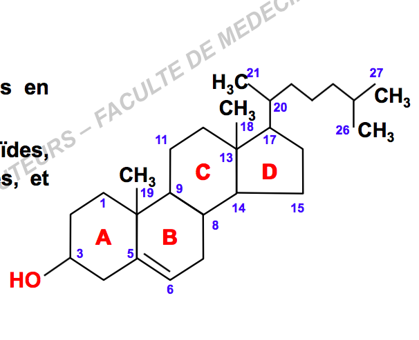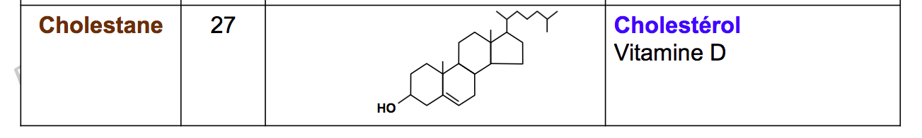 j'ai une petite question par rapport au cholestérol et à son noyau : le prof nous explique que la structure du cholestérol se fait à partir du noyau cholestane auquel on ajoute quelques trucs pour faire du cholestérol. Mais je n'arrive pas à voir où est la différence entre cholestérol et cholestane , donc si vous pouviez m'expliquer ce serait toooooop ; merci !!