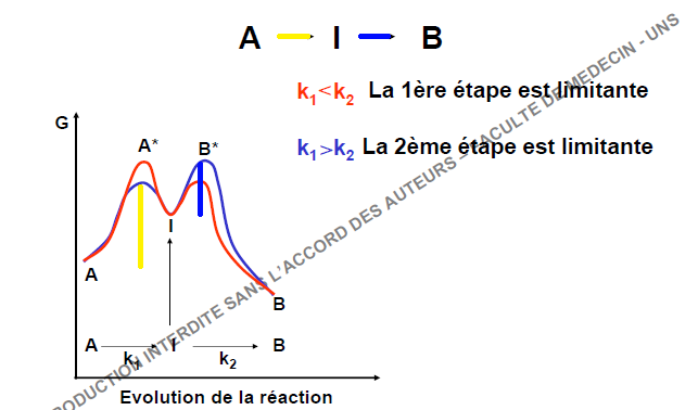 Alors ce n'est pas une nouvelle partie donc il est possible que la queston aie déjà été posée le années préédentes, mais hier matin la prof a bien insisté sur la diapo 30, où elle a bien précisé que dans le deuxième cas l'énergie d'activation pour la deuxième étape (soit pour passer de I à B) était plus forte que celle pour passer de A à I, faisant de la deuxième étape l'étape cinétiquement déterminante. Sauf que graphiquement je trouve ça étrange...