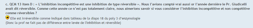 Et le qcm 18 des annatuts 2015-2016 " L’inhibition incompétitive est une inhibition de type réversible" compté faux, car elle serait donc irréversible.