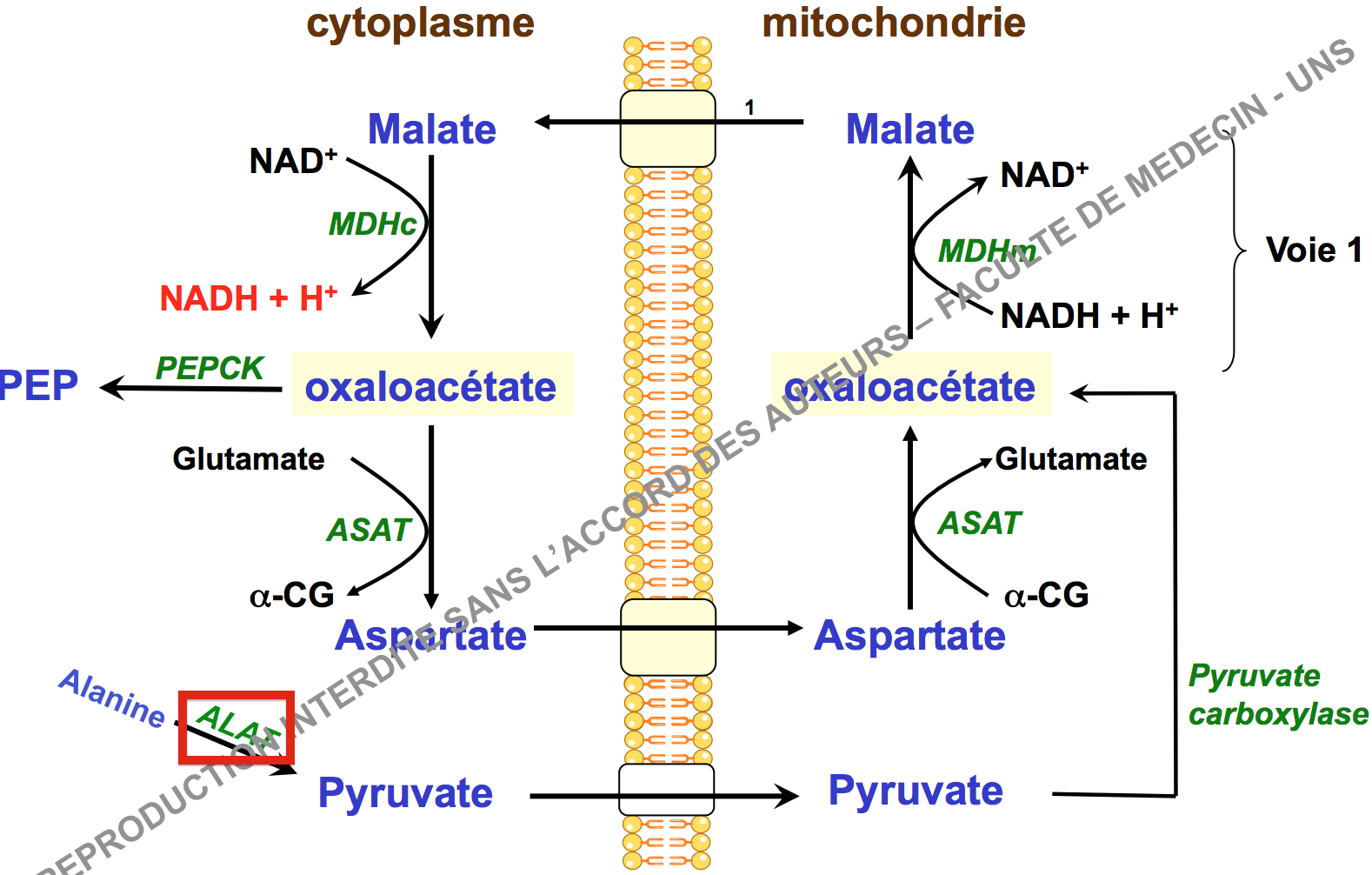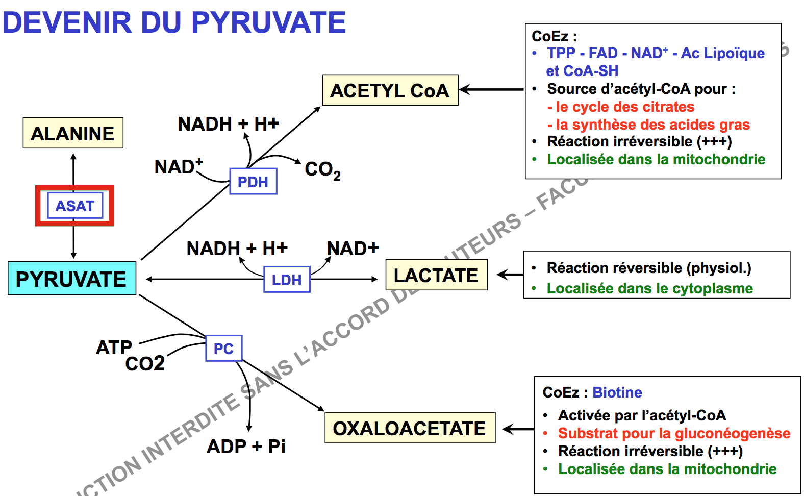Dans le cours sur la glycolyse, on a une diapo sur le devenir du pyruvate, avec une réaction dans laquelle le pyruvate donne l'alanine avec l'enzyme ASAT, alors que dans une autre diapo cette même réaction se fait avec l'enzyme ALAT :desire: