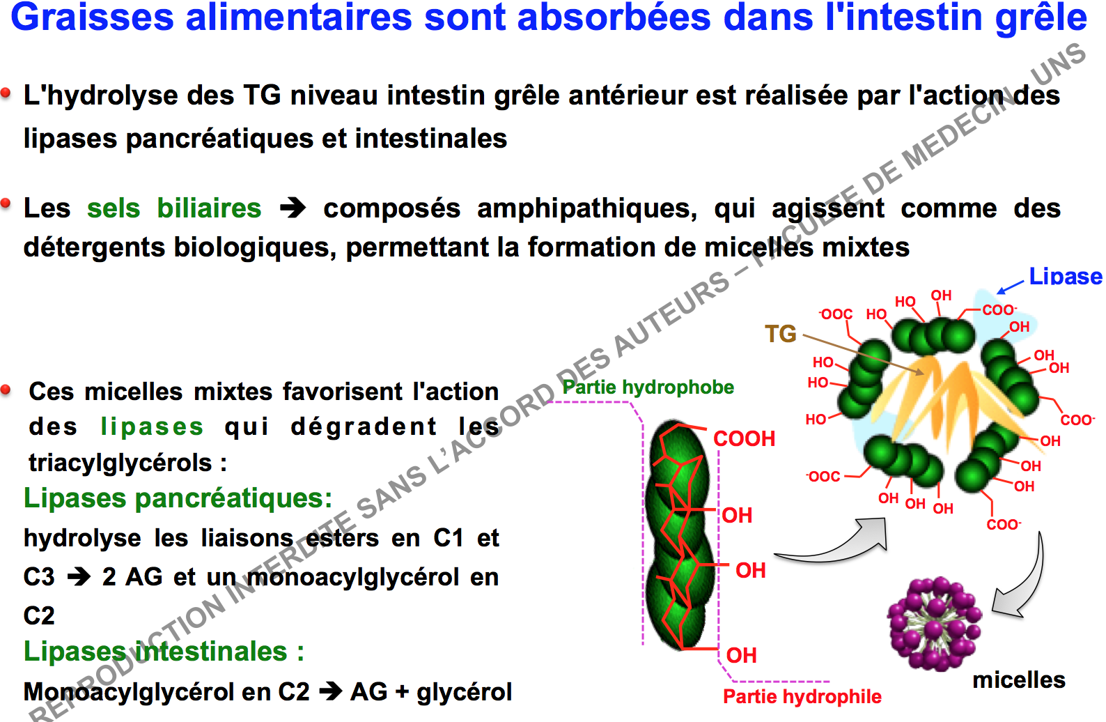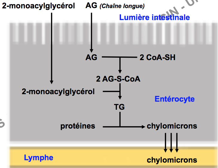 En fait dans ces diapos, on nous dit que 2 lipases interviennent au niveau de l'intestin, la lipase pancréatique transforme le TG en 2AG + MAG et la lipase intestinale (si elle intervient) transforme ce MAG en AG + Glycérol. Ensuite normalement les AG + MAG (+ sels biliaires) sont retransformés en TG pour être transportés dans des chylomicrons