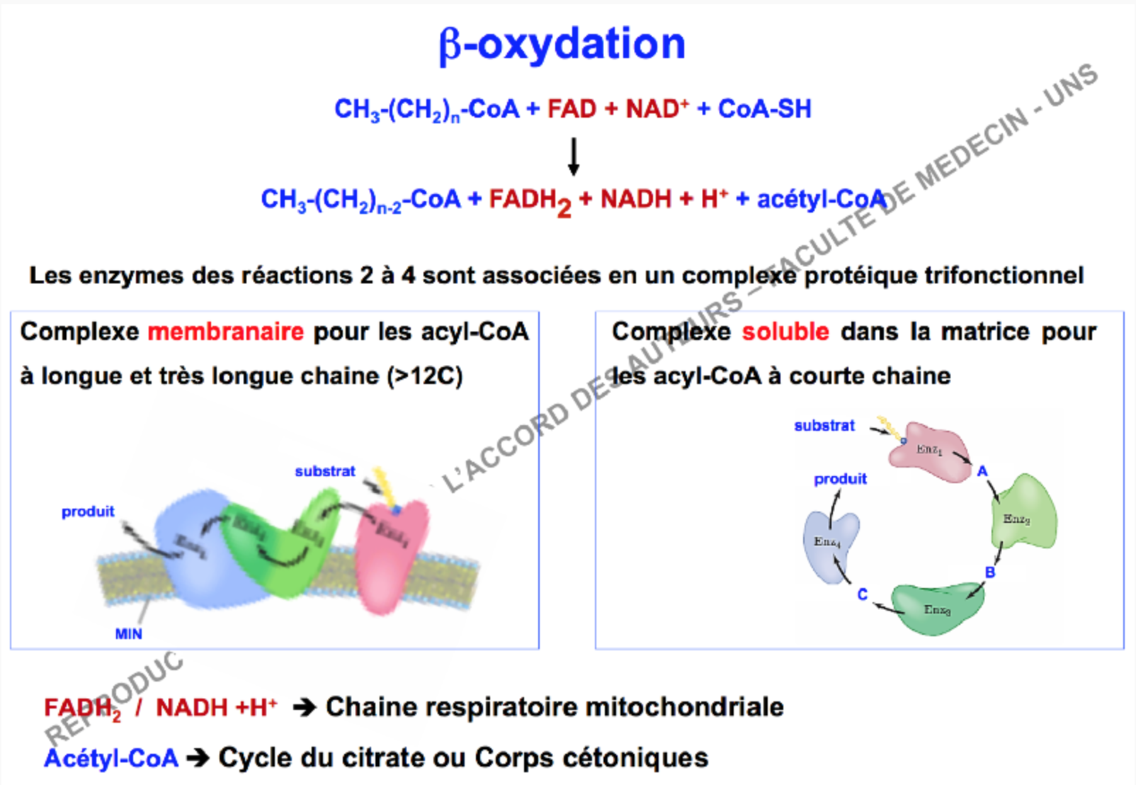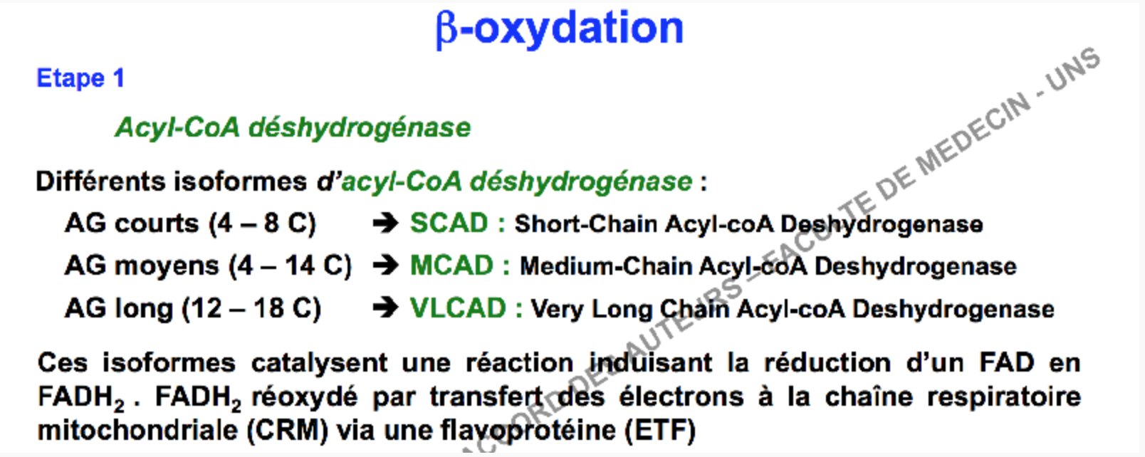 Mais il me semble que c'est le cas pour les enzymes 2 à 4 de la B ox (cf diapo 1), soit le complexe est soluble soit il est membranaire, mais pour l'enzyme 1 Acyl CoA DH on parle de VLCAD MCAD SCAD en fonction de la longueur de l'AG et pas du fait qu'il soit soluble ou associé à la MIM (cf diapo 2) c'est ça ?