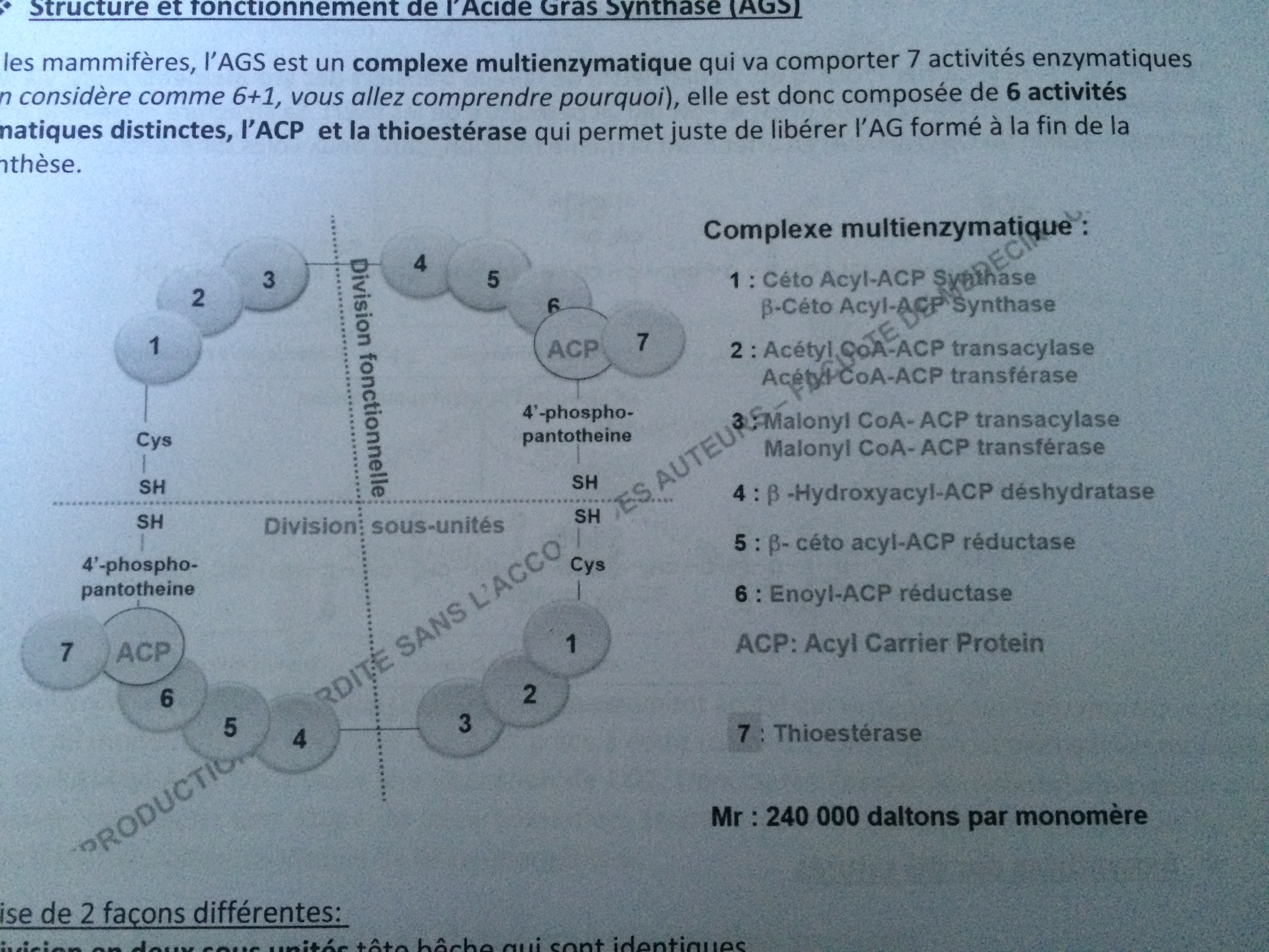 Alors voila, dans la ronéo 14 sur la biosynthèse des AG, il y a ce schéma recap des complexes multienzymatiques :