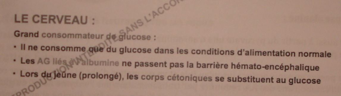 Ce qui veut dire qu'il ne consomme que du glucose (d'abord celui de la GGL puis celui de la NGG comme dans ma réponse précédente) mais dans les situations de jeûne prolongé, aucune molécule de glucose ne peut être produite, nous sommes dans une situation anormale et le cerveau se tourne alors vers les CC :)