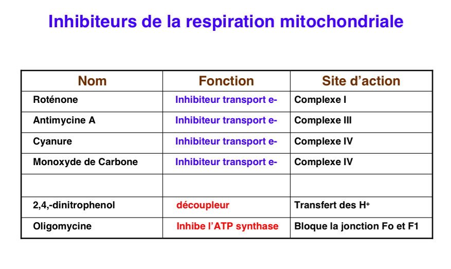 J'suis allé un peu plus loin que ta question, mais c'est parce qu'en général on a du mal à comprendre la nuance entre les inhibiteurs et les agents découplants (j'avais du mal l'année dernière :p )
