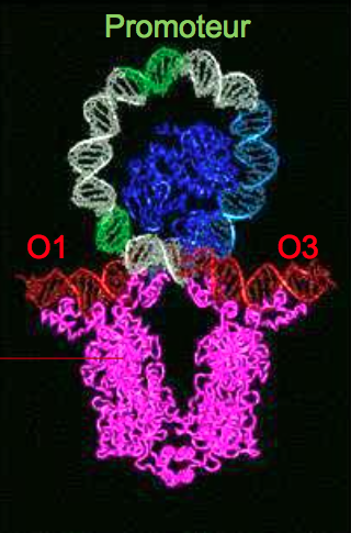 Je pense avoir compris que le promoteur et la machinerie basale sont sur l'ADN et que lorsque la protéine lacl va se fixer sur les opérons, elle va rapprocher les opérons entre eux et donc plier la partie où il y a le promoteur et faire que l'ADN forme une boucle autour de ce dernier pour le bloquer.