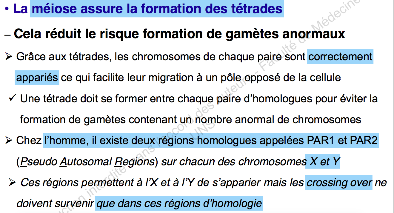 Dans son cours le prof a énoncé des crossing over sur les parties pseudo autosomales des chromosomes X et Y lors de la prophase 1 de la méiose 1 OR en BDR nous avons vu que les chromosomes sexuels ne subissaient AUCUN crossing over et étaient mis dans des vésicules