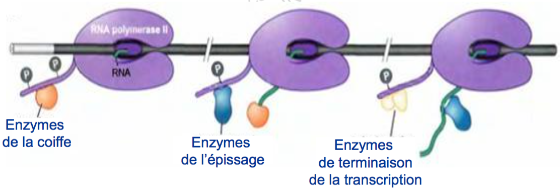 selon l'état de phosphorylation de l’extrémité C-terminale de l'ARN Pol, on va avoir un recrutement successif des différents enzymes de maturation du pré-ARNm.
